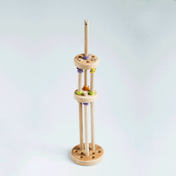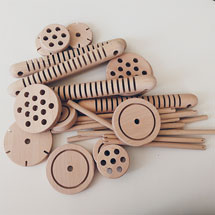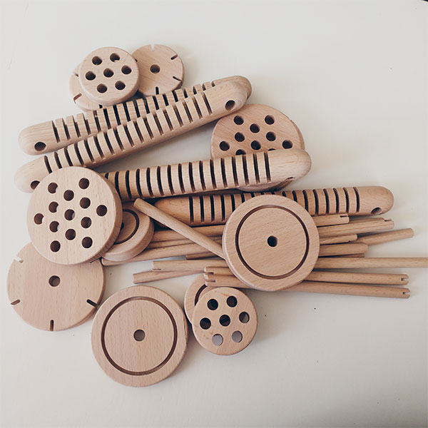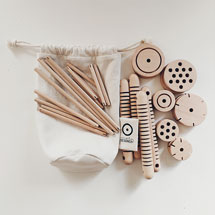 30 elementów z drewna bukowego, worek z surowej bawełny do przechowywania i zestaw kolorowych gumek recepturek