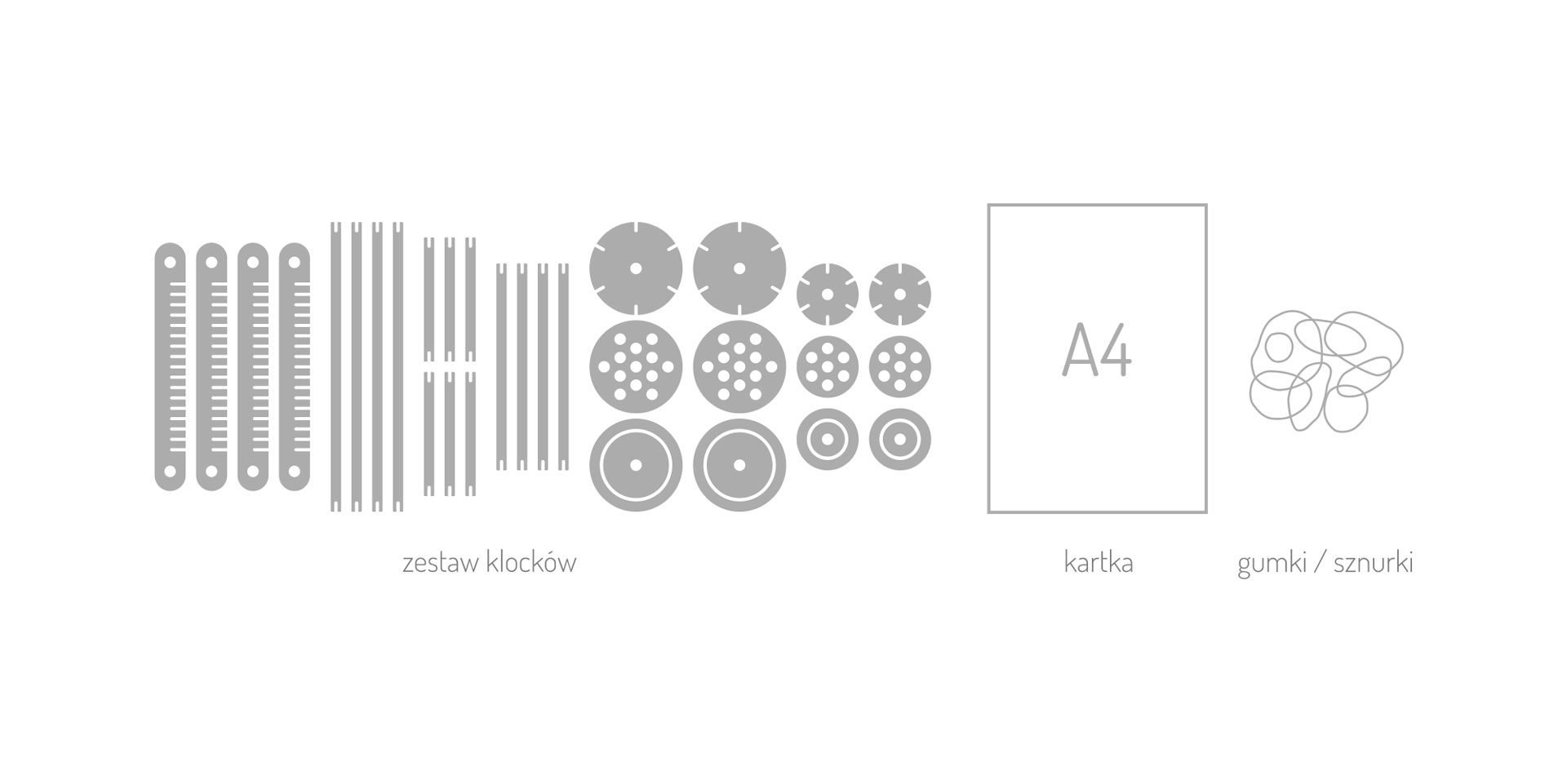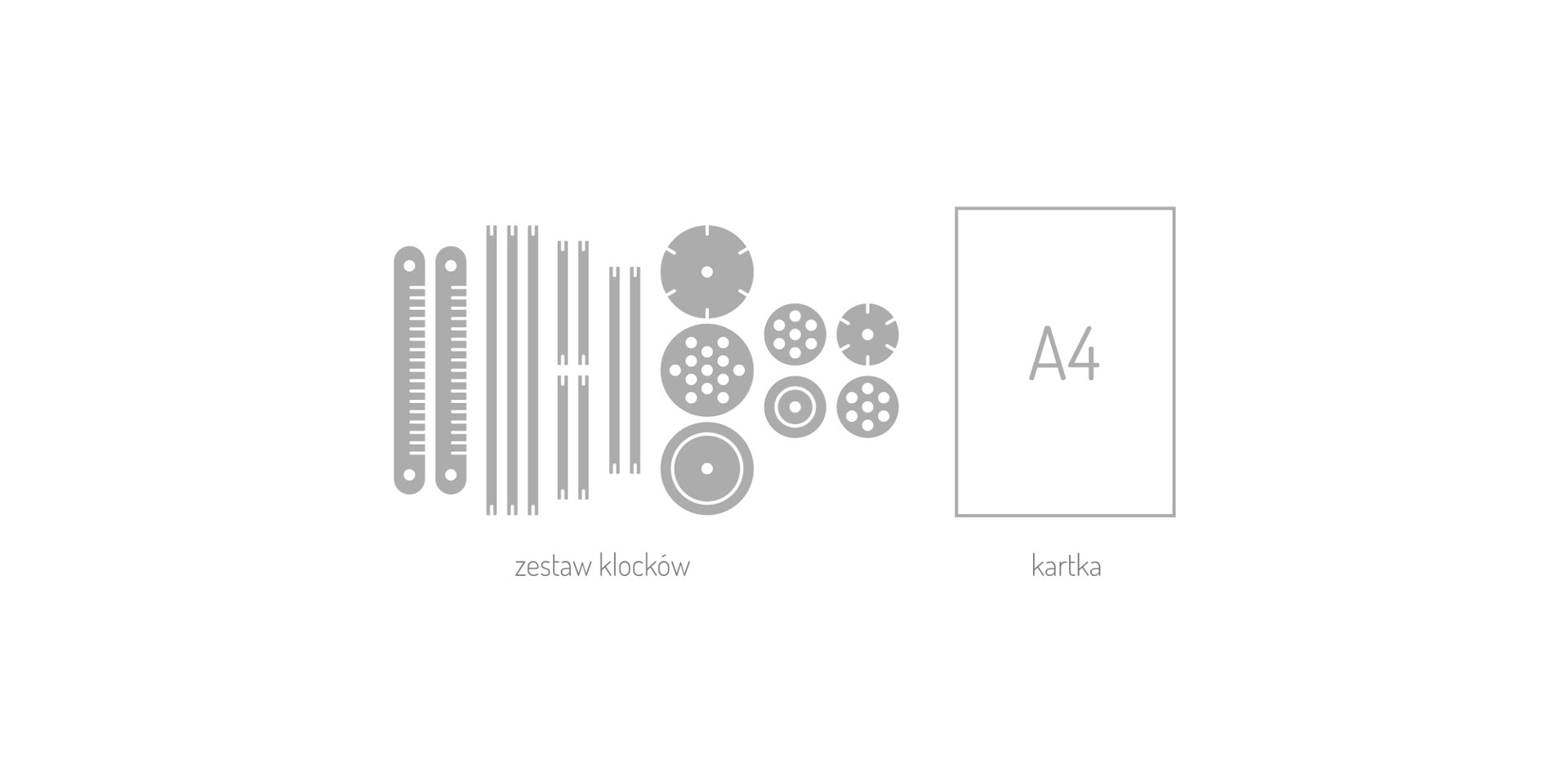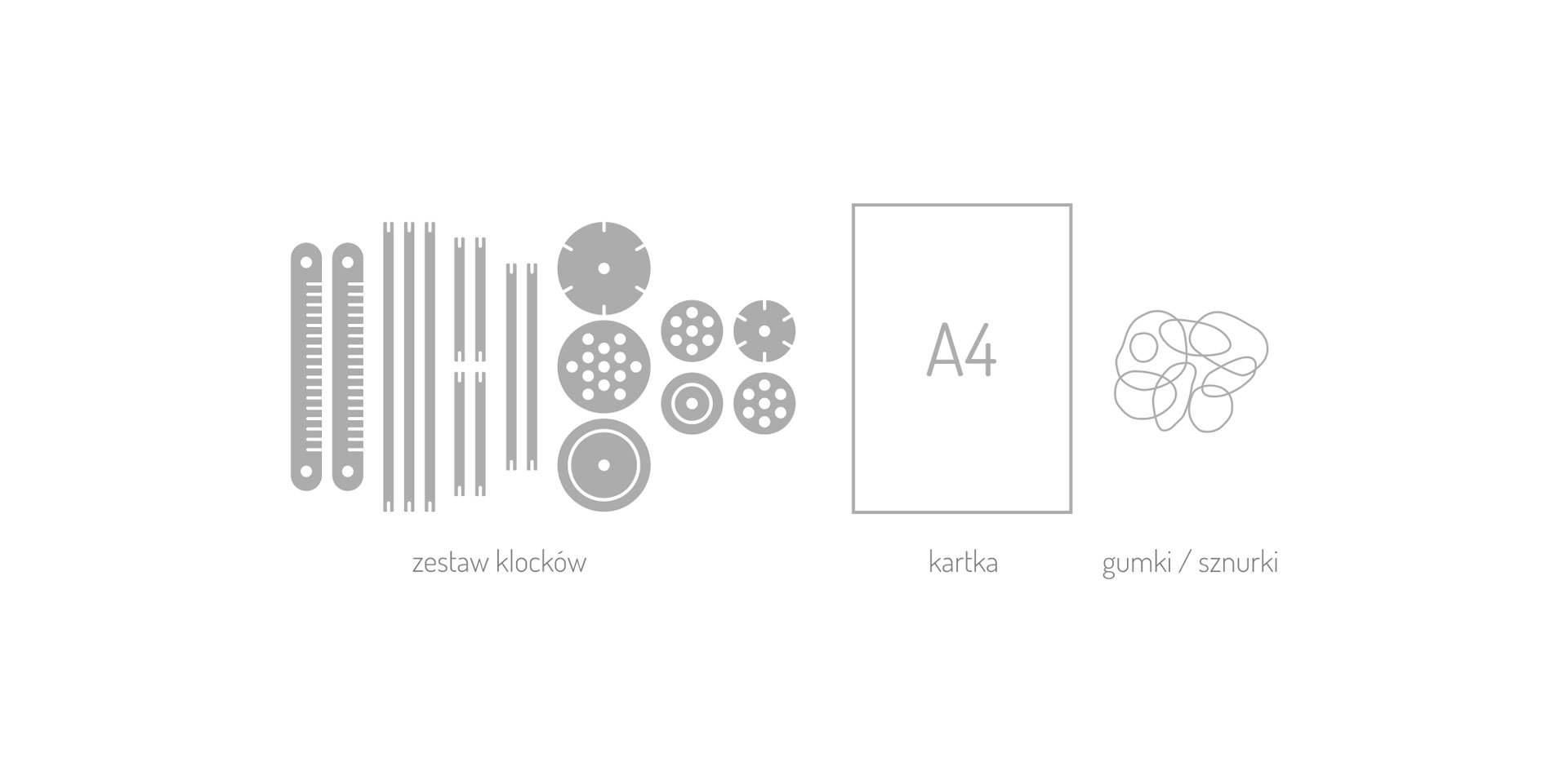 Dziecko ma do dyspozycji pełen zestaw klocków, kartkę formatu A4, element łączący / gumki recepturki, sznurek /.